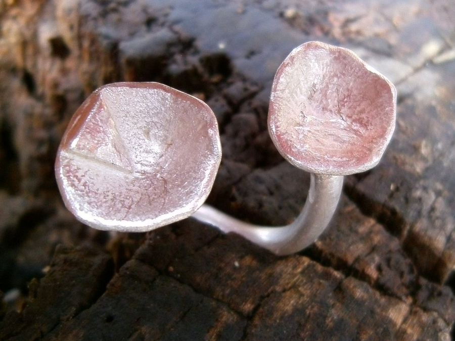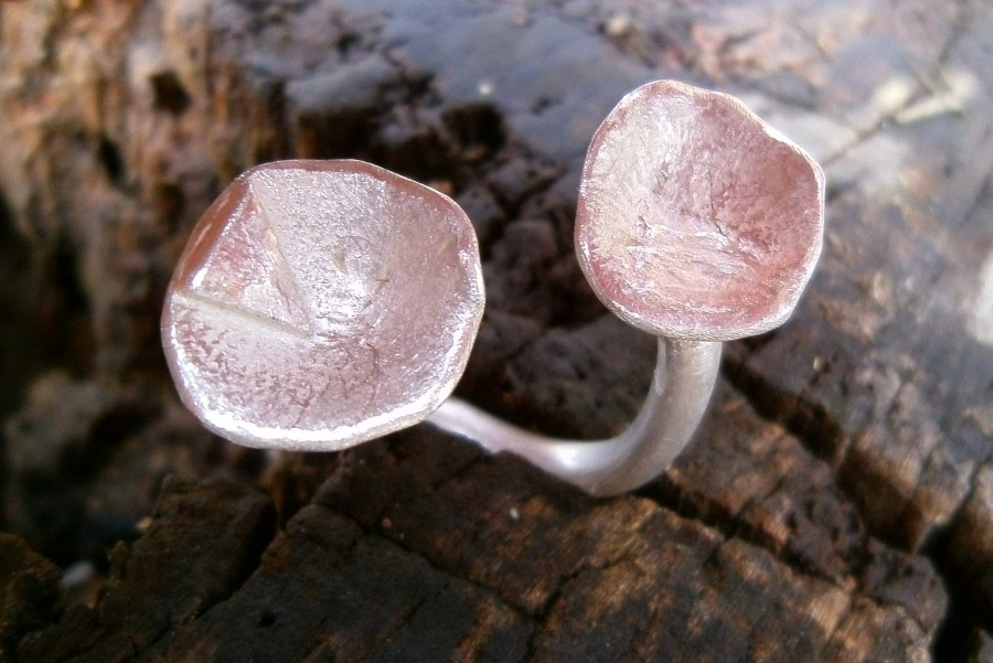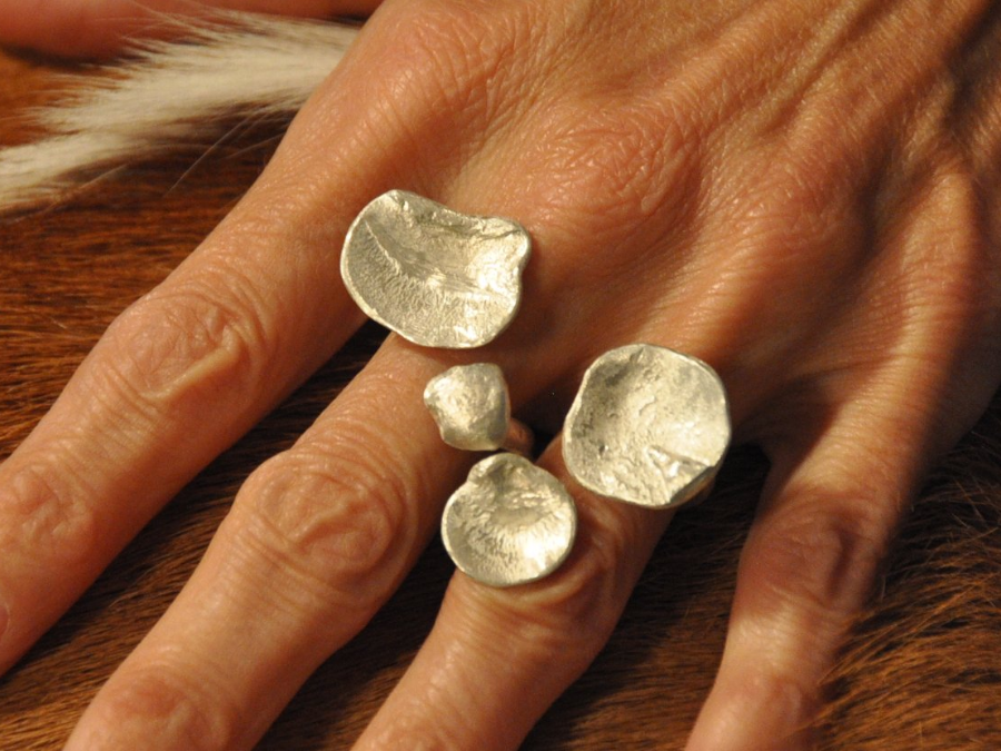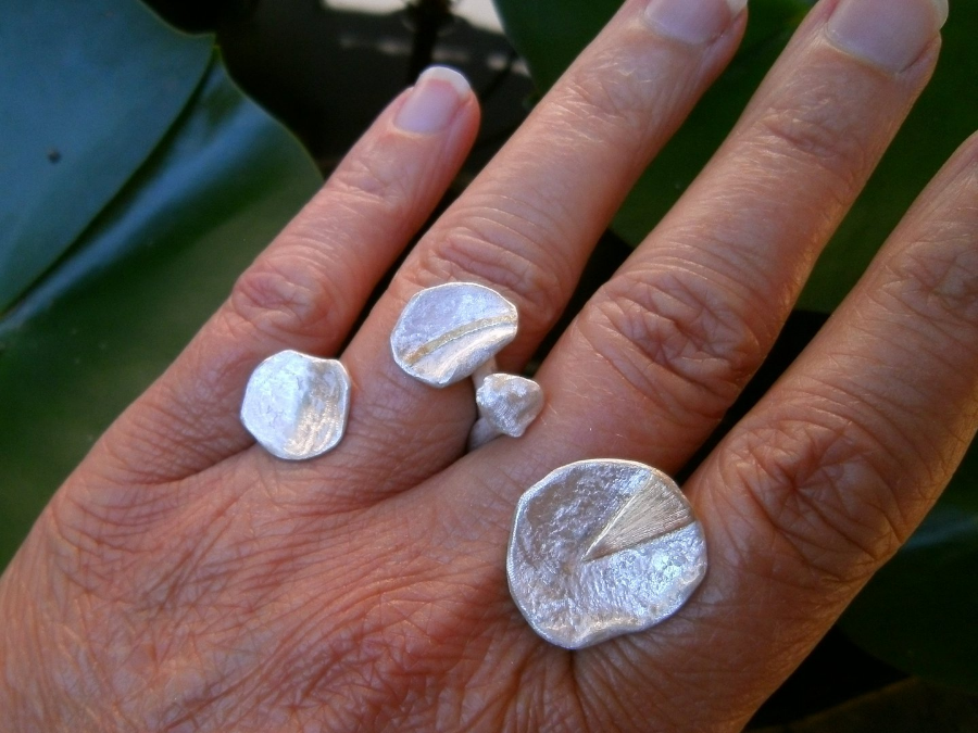 Dieser Ring ist (unscheinbar) sehr bequem. Jeder Ring ist ein Einzelstück in Schweiß- und Löttechnik gefertigt. Der Ring sitzt locker auf der Hand, daher spührt man den wenig. Der Ring erinnert an Seerosenblätter die auf dem Wasser schwimmen.